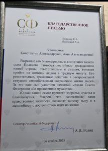 Заслуженная награда — медаль Совета Федерации «За проявленное мужество». Вручил медаль сенатор Совета Федерации от Приморского края Александр Ролик, а родителям – Благодарственное письмо, за воспитание сына.