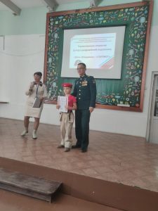 В рамках торжественной части юнармейцу Якову Теплякову вручили сертификат о сдаче норм ГТО на золотой значок.