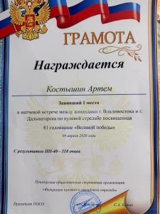 Юнармеец отряда имени мичмана Кондратьева А. П., ученик 6 «Ю» класса гимназии № 2 г. Владивостока Костышин Артём принял участие в матчевой встрече между командами Владивостока и Дальнегорска по пулевой стрельбе.