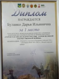 А заместитель командира юнармейского отряда Булавко Дарья заняла 1 место в конкурсе «Герои Хасана на карте России — Герои Великой Отечественной Войны»!