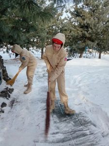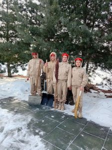 Ребята очистили прилегающую территорию памятного знака первым поселенцам села Сальское от снега и наледи.