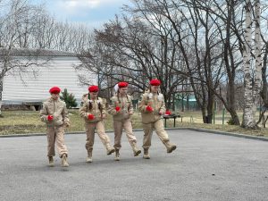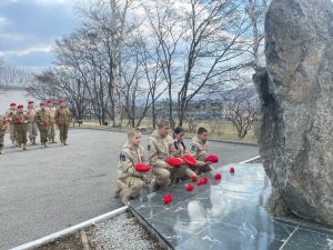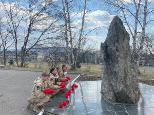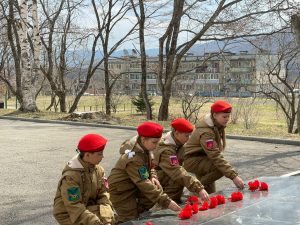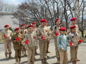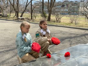 Здесь собрались юнармейцы отряда «Патриот» школы № 15, а гостями встречи стали юнармейцы отряда «Наследники Победы» школы № 27 пгт Смоляниново. Ребята почтили память погибших минутой молчания и возложили цветы.